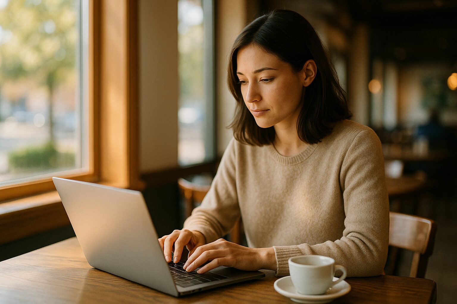 「カフェでノートPCを操作する女性。自然光が窓から差し込む午後、柔らかなボケ味を添えて静かな雰囲気で。」