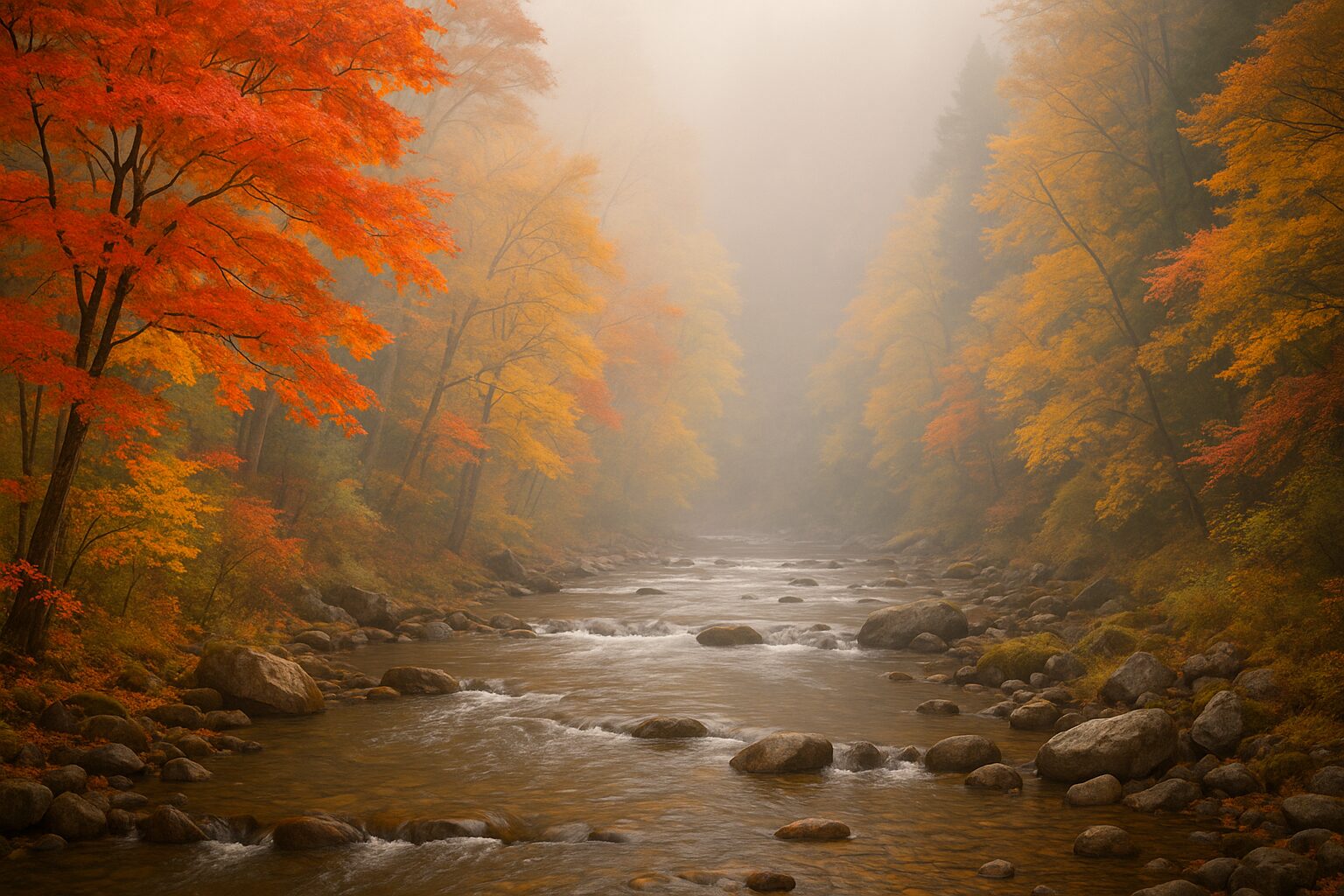 「秋の渓谷。紅葉の木々と流れる川、霧がかかったような柔らかな光で幻想的な風景。」