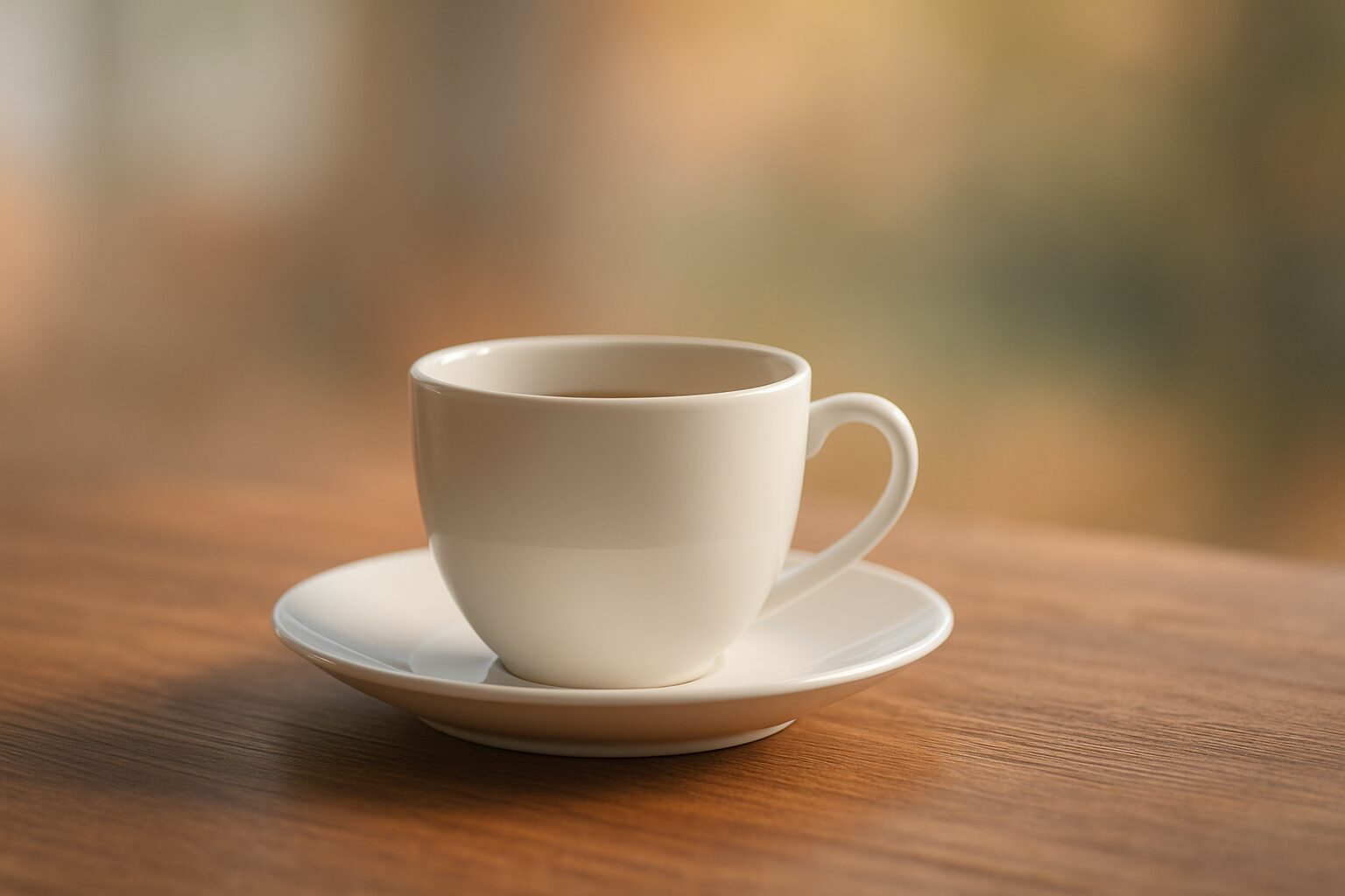 「木製テーブルの上に置かれた白いコーヒーカップ。自然光が差し込み、やわらかい影ができている。背景はぼかして、商品が際立つ構図で。」