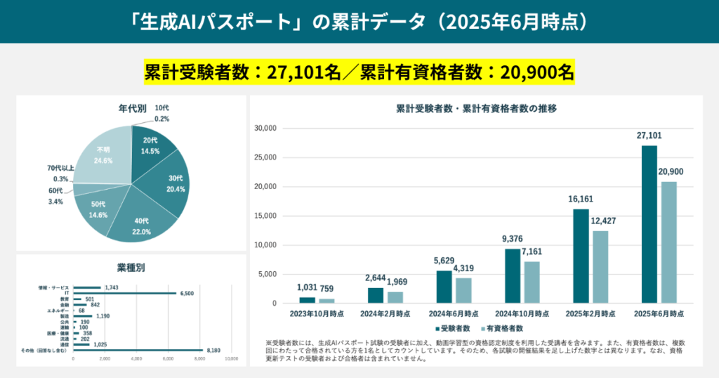 このように、受験者数・有資格者数ともに急速に増加しており、企業・教育現場を中心に「AI活用リテラシー資格」としての注目度が高まっています。
