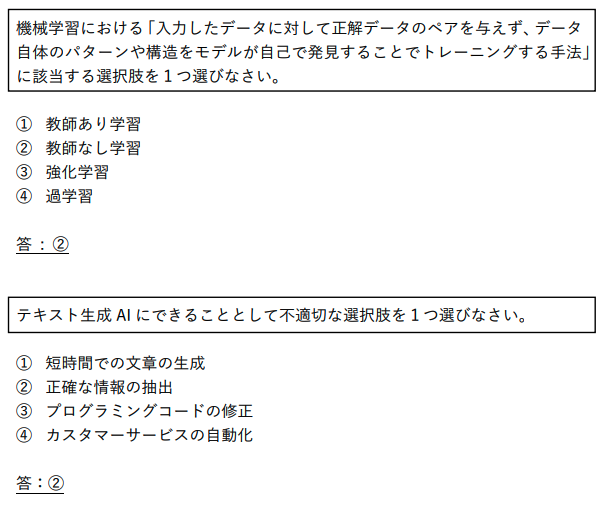 出題は四肢択一式(1問1答)であり、AIの基本原理から生成AIの活用範囲まで幅広く問われます。